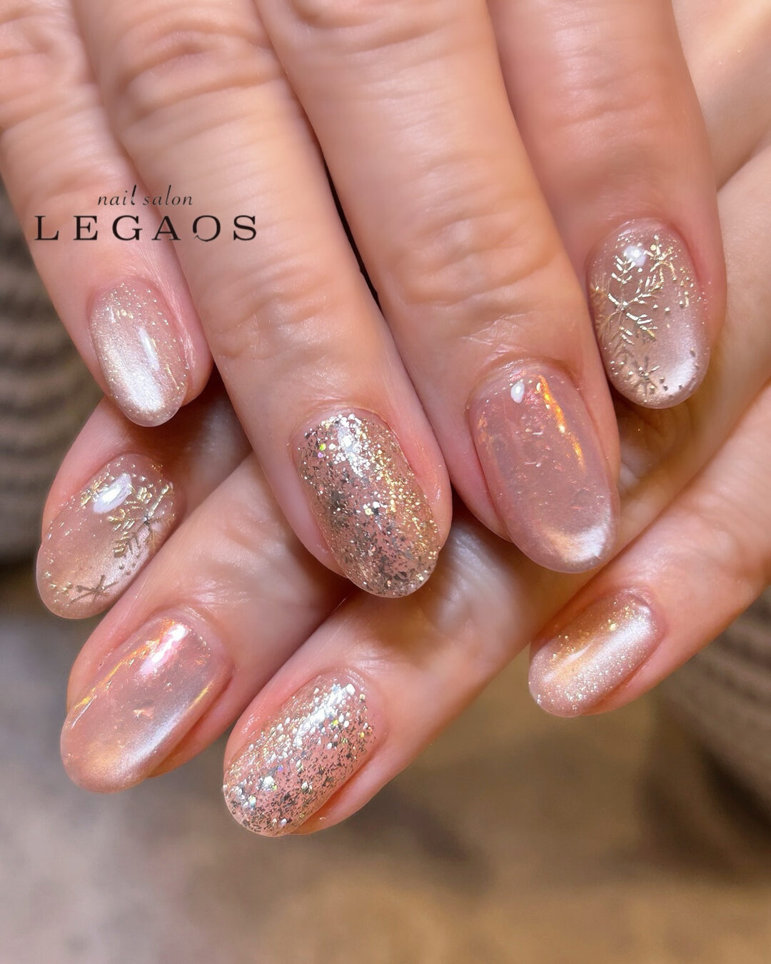 細かなラメと雪の結晶アートが、冬らしさをさりげなく演出します。
