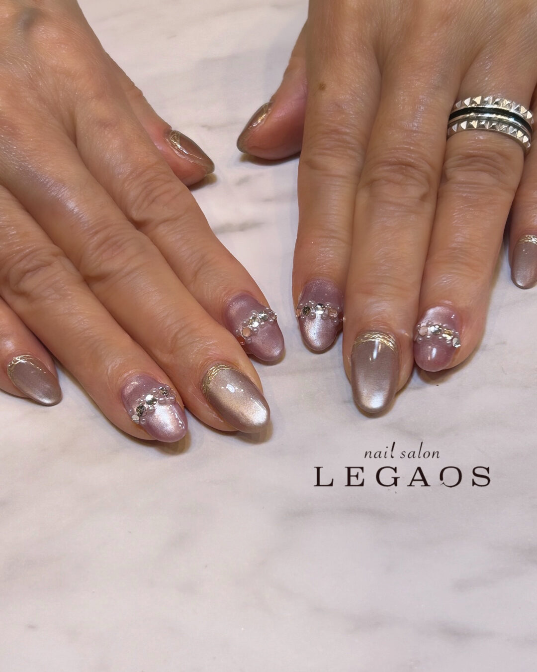 落ち着いたモーヴカラーに 落ち着いたモーヴカラーに 上品なマグネットネイルの艶。 ストーンをさりげなく並べて 指先にほどよい華やかさを。 甘すぎない、 大人のためのエレガントネイルです。 ✂︎⸻ スキル 投稿日 2026年2月16日 ← 2月キャンペーンデザイン くすみグリーンをベースに →