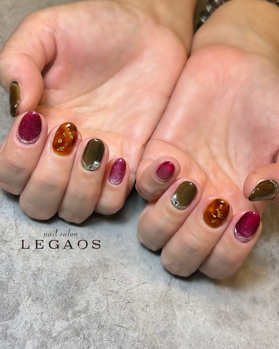 深みのあるワインレッドに、カーキと琥珀カラーを合わせた秋冬らしい指先✨