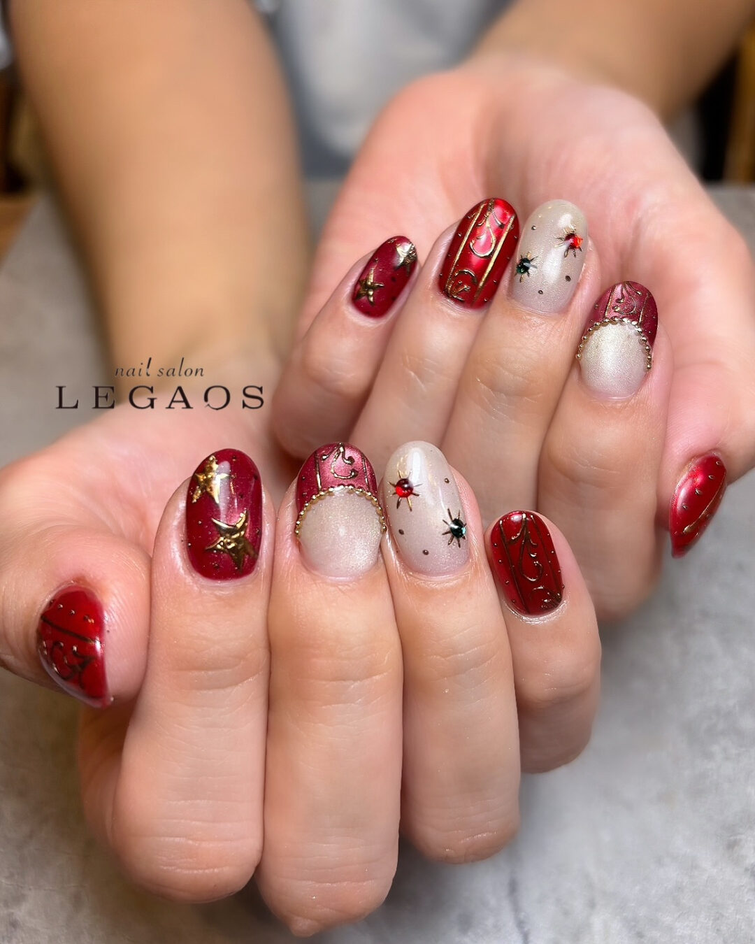 深みのある赤をベースに、星やビジューを散りばめた華やかなデザイン✨