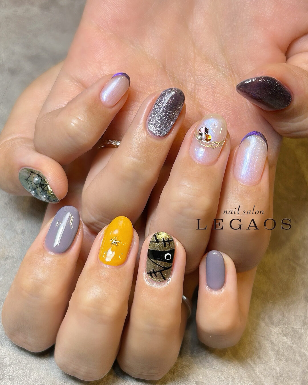 Halloween Nail Halloween Nail ハロウィンデザインで指先から気分アップ 遊び心たっぷりのミイラアートと、 パープル×オレンジの組み合わせで大人可愛く✨ ✂︎-------------- スキル 投稿日 2025年10月6日 ← 10月のキャンペーンデザインをお届け ️Autumn Magnet Nails️ →